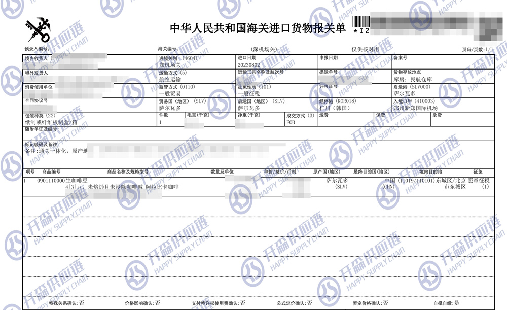 【本文結語】 上述就是薩爾瓦多生咖啡豆進口報關代理【鄭州機場清關案例】的全部內容,希望能對您有所幫助,如有咖啡豆進口報關上任何疑問及問題可隨時在線聯系我們或撥打 18002611553,開森供應鏈擁有豐富的咖啡豆進口報關操作經驗及案例,10余年進口經驗為您所用,各類進口疑難都能為您一一解答及協助快速處理解決!